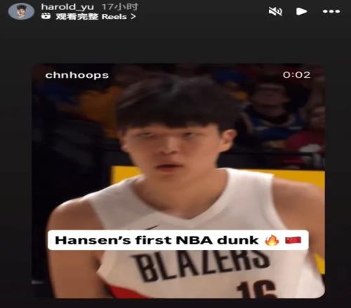 或许因为是同在国外,又或许都是大中锋的缘故,当杨瀚森完成NBA生涯首个扣篮的时候,余嘉豪赶紧进行了转发。