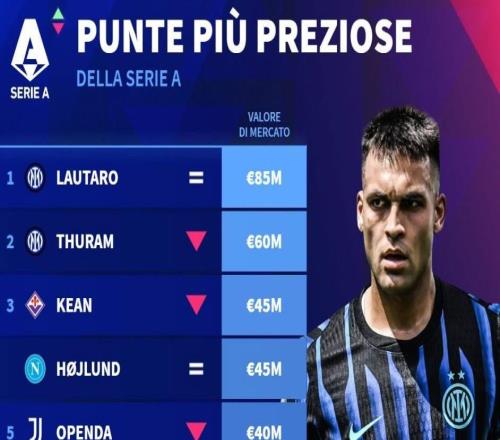 意甲身价更新:劳塔罗跌至8500万欧仍最高,伊尔迪兹涨至7500万欧