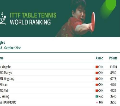 据央视新闻消息,10月21日,国际乒联公布2025年第43周排名:女单方面,孙颖莎11600分连续第171周霸榜第一,王曼昱8850分排名第二,陈幸同6075分排名第三。男单方面,王楚钦10900分排名第