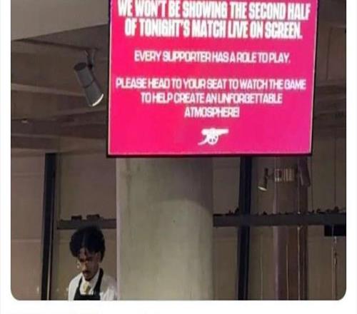 近期,阿森纳推出一项新策略,意在改善酋长球场的整体观赛氛围,鼓励球迷为球队加油助威。在对阵马竞的欧冠比赛中,酋长球场大厅内的电视上并没有播放下半场的比赛。屏幕上显示了一