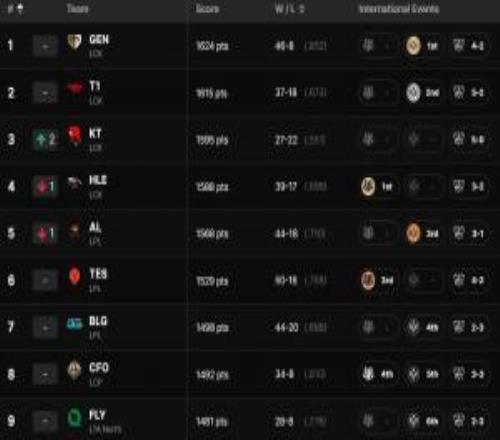 官网更新全球战队实力排行榜:GEN第一T1第二,KT升至第三!